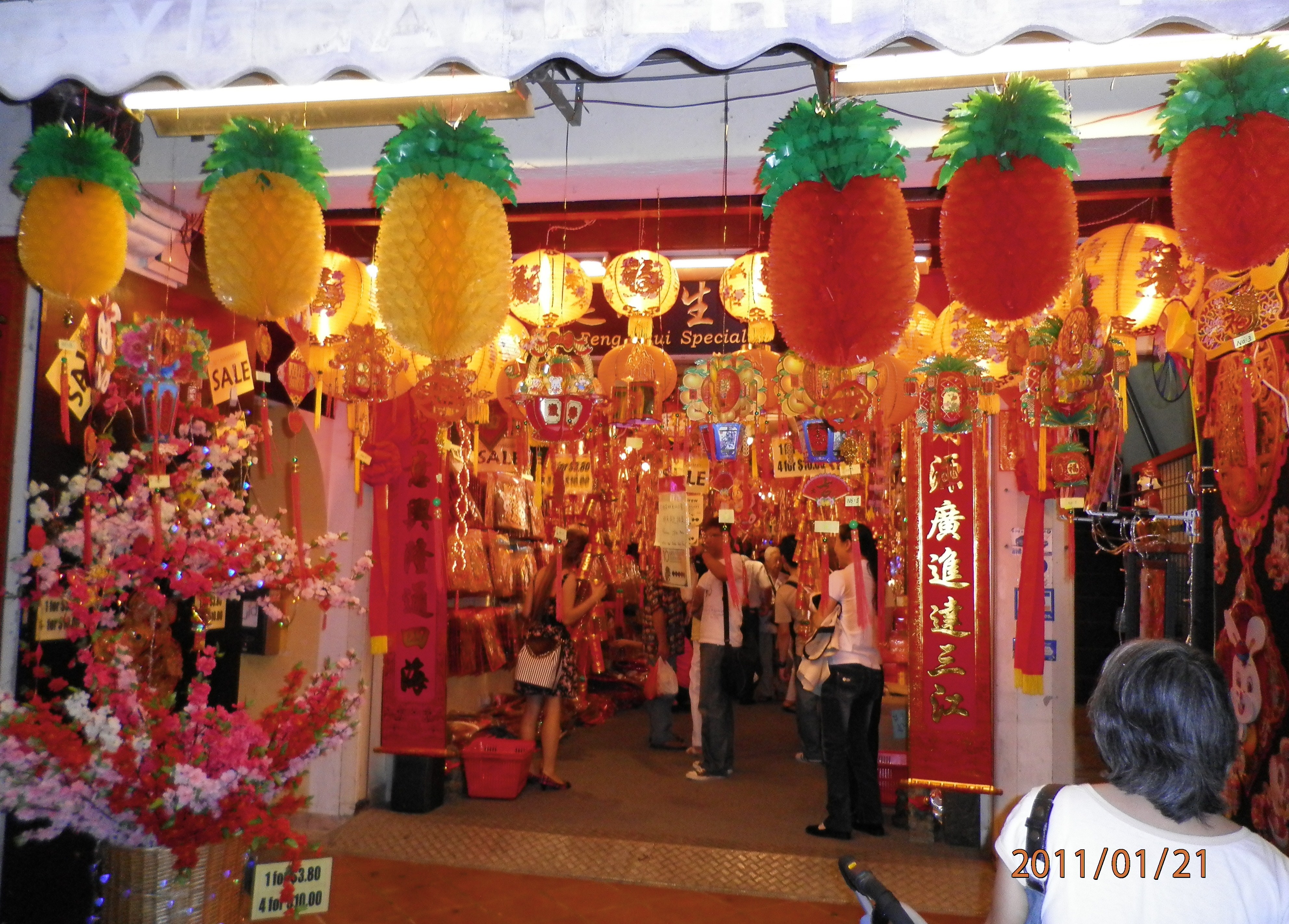 What is in the stall? The stall is selling Chinese New Year decorative items, like 春联(Spring Festival couplets) and many decorative items related to rabbits. As you can see, there are 6 big ” lanterns” hanging on top. Well, those are not lanterns. They are pineapples, used for decorative purposes. Pineapples in Hokkien (a dialect) is called “Ong Lai”. To translate it literally, it is called “wealth come”, meaning bringing wealth to those who hang these pineapples in their shop or house or anywhere.