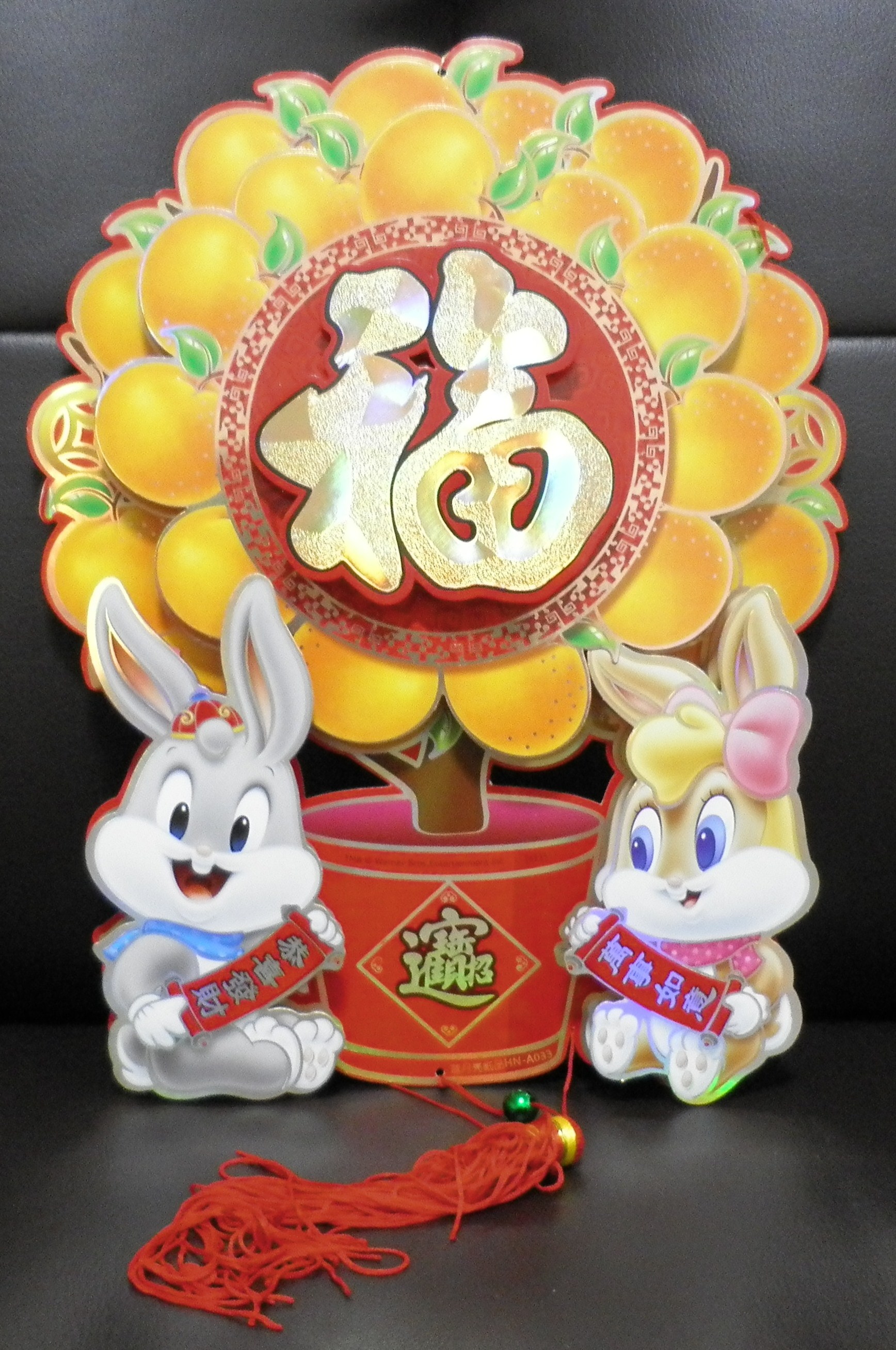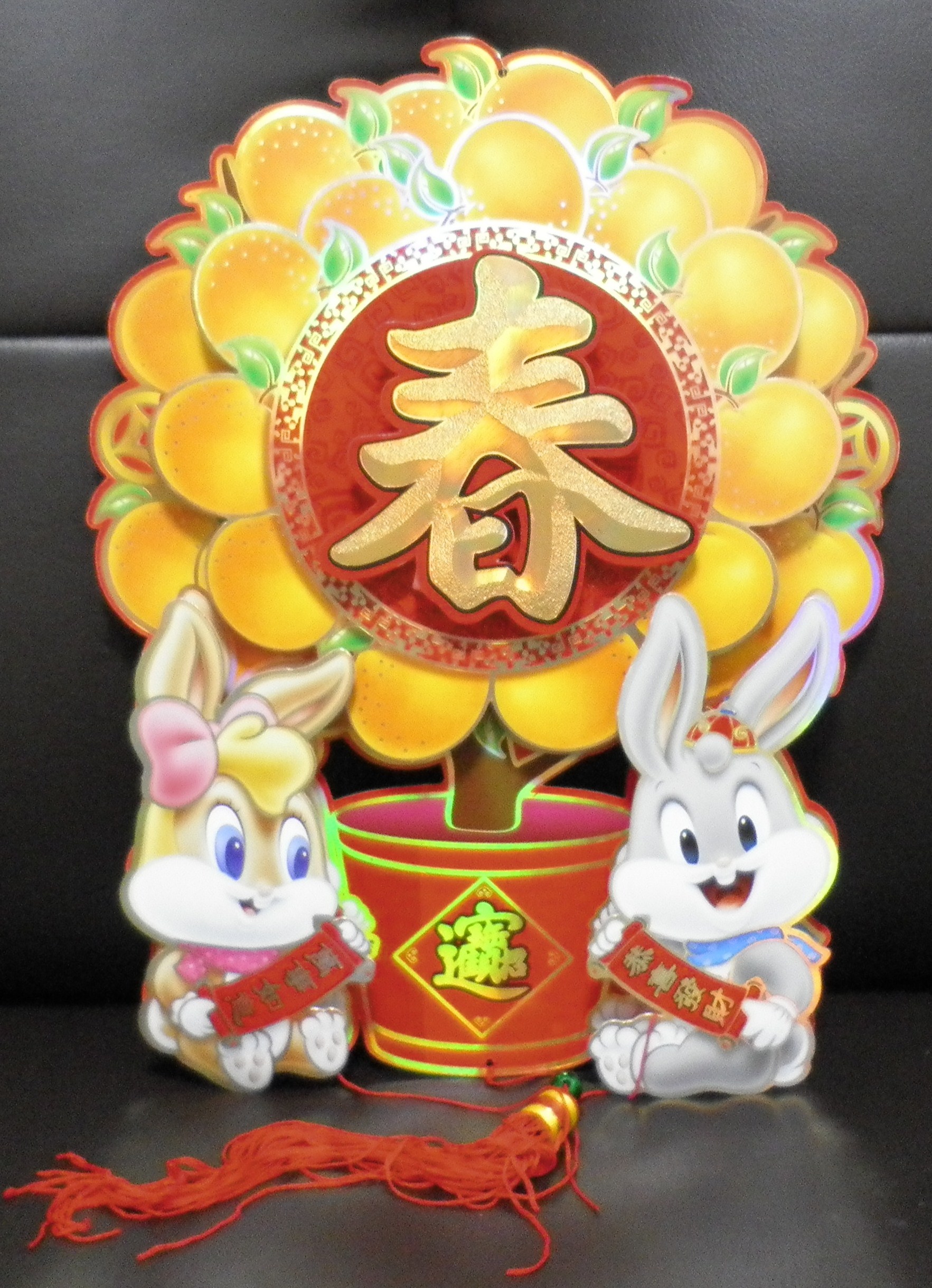 my humble flat. The pictures on the left and right which is the front and back of the decorative item is what I bought to hang from my ceiling. Yeah, baby bunnies:). Mandarin Oranges symbolize luck and wealth and I have a pot of tangerine plant. On the left 福, pronounced as “fu” means “good fortune” and on the right, 春 pronounced as “chun” means “spring”.