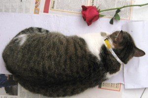 I couldn’t get her up, so I put a red rose beside her and took a picture. I wanted to clear the newspaper after I had finished with my flower arrangements. However, Miemi just wouldn’t let me clear it. Her best weapon is her weight. She just slept on the newspapers. She always does that.