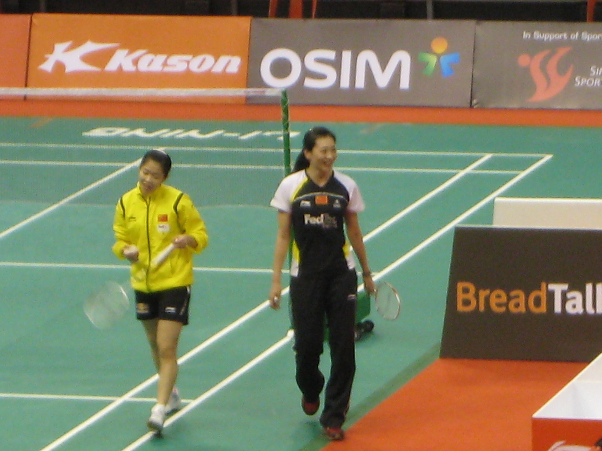 The picture on the right was taken before the matches start. The woman wearing black shirt and black track pants is Zhang Ning. The last time I saw her was a few years ago. She has retired. She was a champion in the woman’s single. Since then, I only see her here as a coach. She is tall. I remember I was about 5 inch below her shoulder when standing beside her. I should have asked her to sign on my shirt:p.