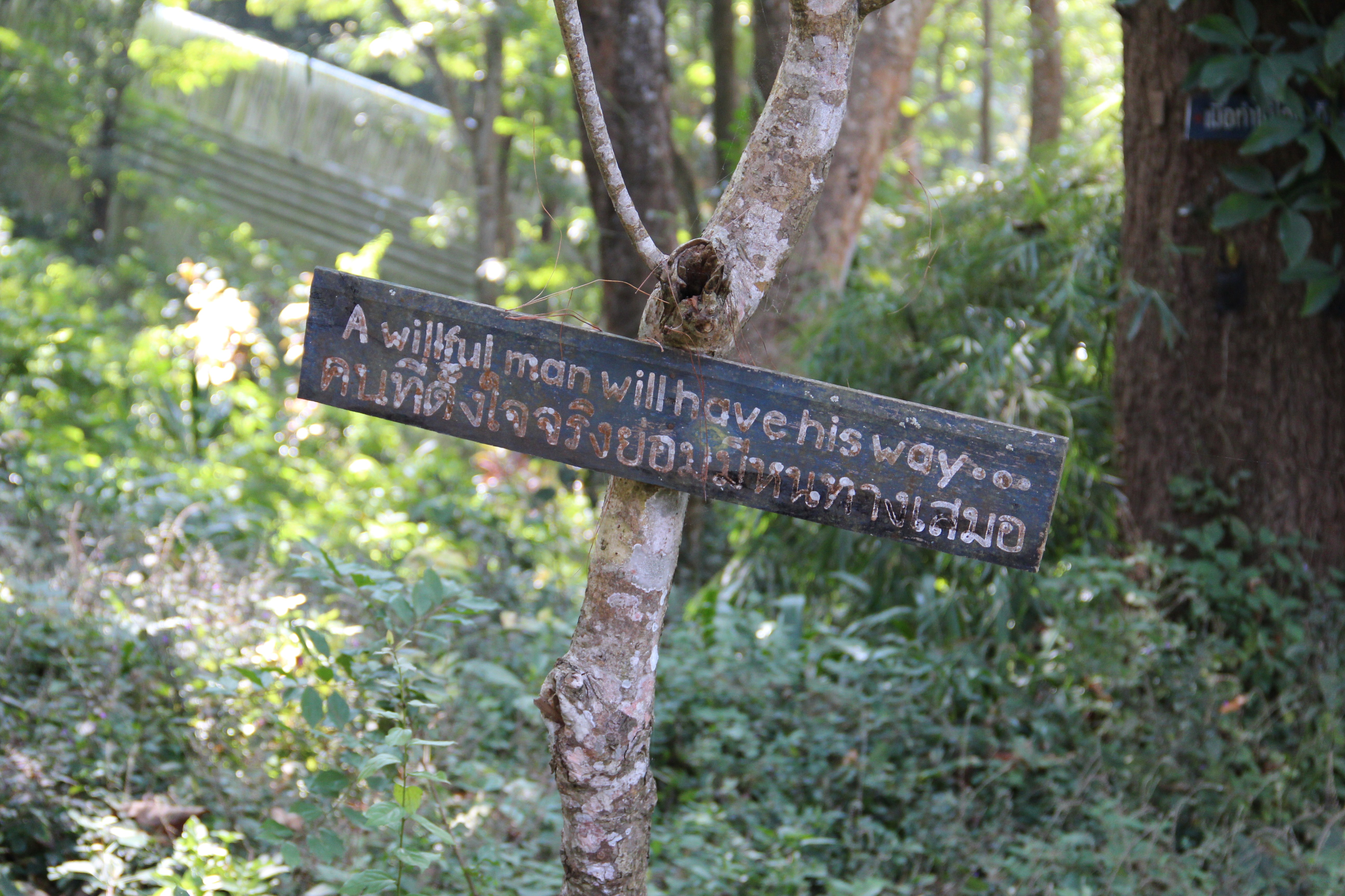 While I was climbing, I saw a sign hanging on a tree which read ” A willful man will have his way…”.