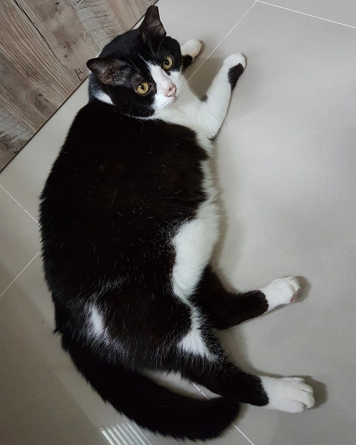 Po had been a good boy. Fat and round just like Po! As he was FeLV positive, he had a room with another 2 cats and at least 3 big scratching posts, plentiful of food and clean water.