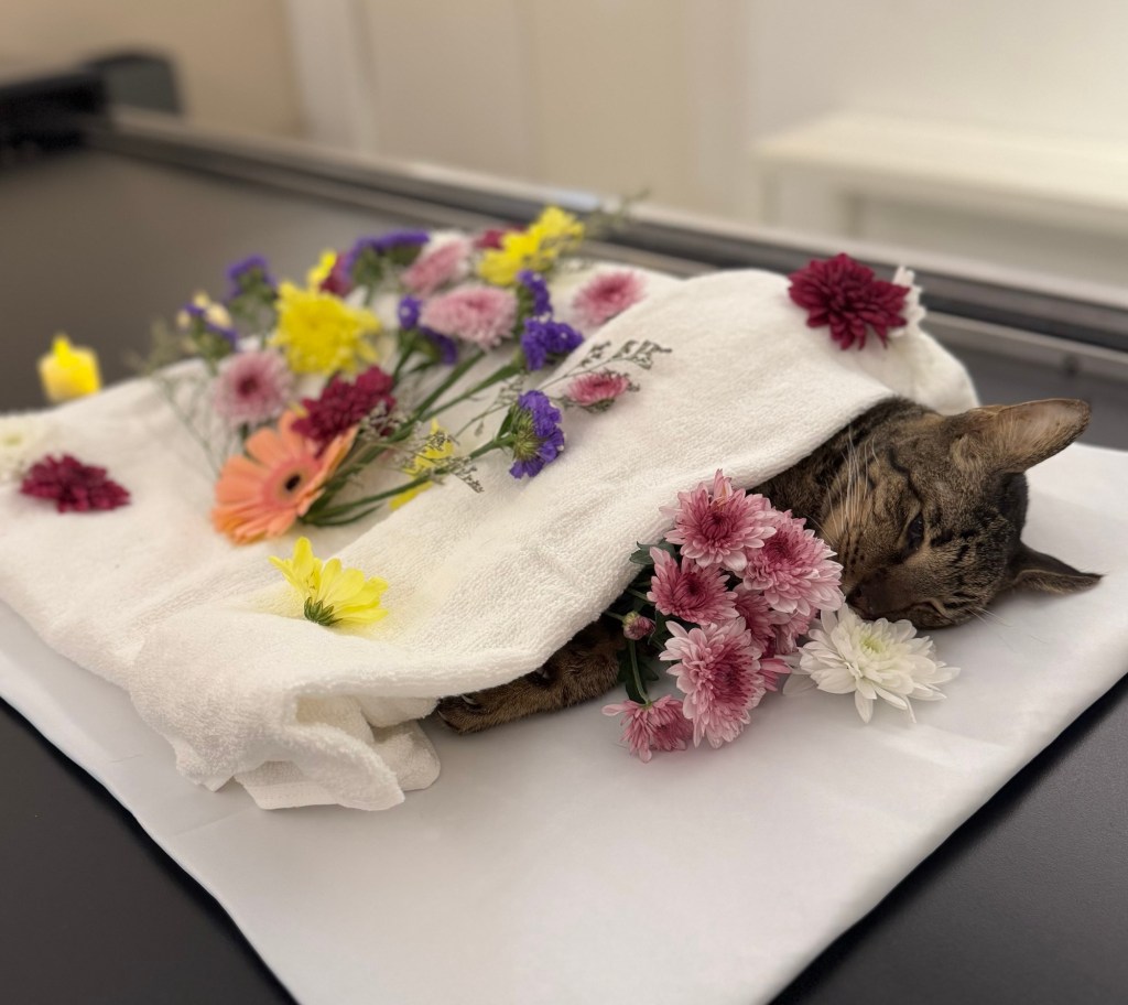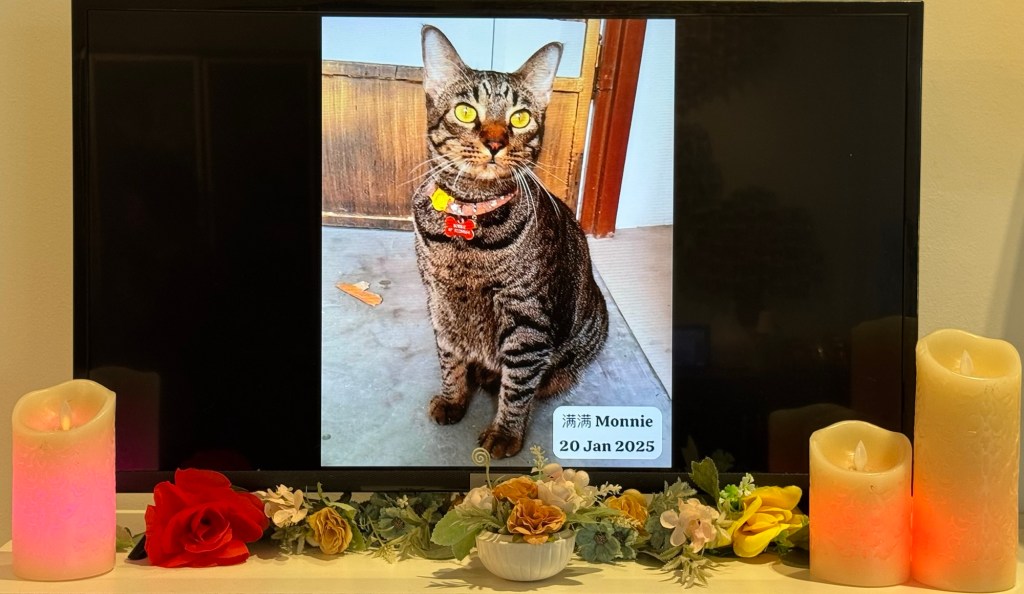 Monnie had a big growth in her lungs as well as pneumonia. Due to her condition, it was unsuitable to do a biopsy on her. All my rescues including Monnie spent their final days or weeks in my tiny meditation room. The little room where I read the Sutta, meditate and gain insights. There’s an altar where I would light up candles for them and wish them well.