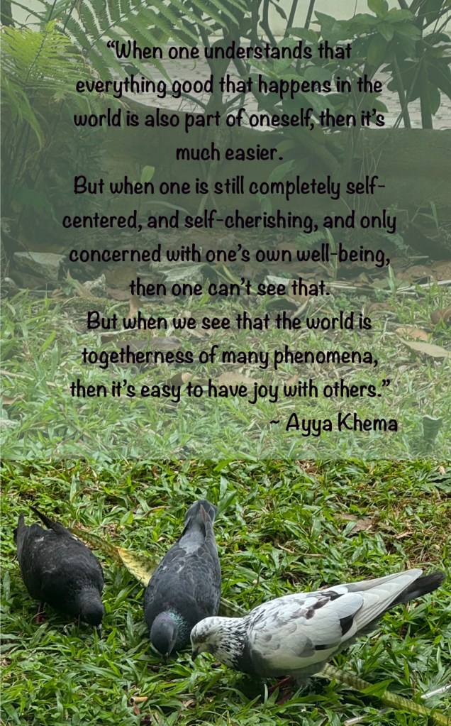 Quoted from the book “The Path to Peace”. Ayya Khema was trying to explain that we should rejoice in the good fortune of all living beings. Treating others with kindness is treating ourselves with kindness. We are all one.